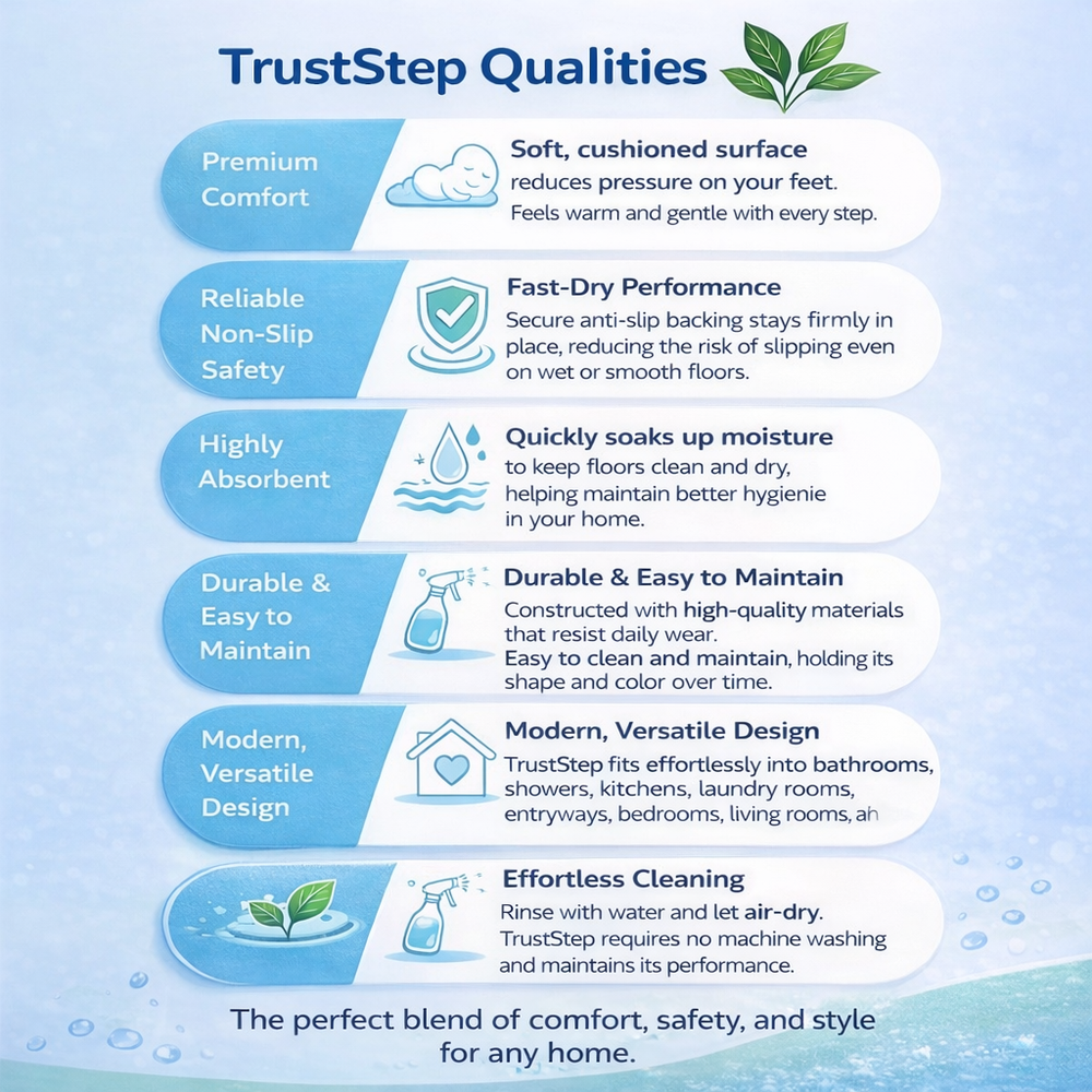 Designed with advanced porous technology, TrustStep dries up to 5× faster than traditional fabric mats. Moisture evaporates quickly, helping prevent mold, mildew, and unpleasant odors.